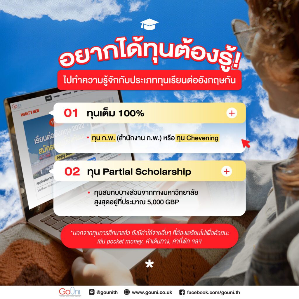 อย่างไรก็ตาม เราปฏิเสธไม่ได้เลยว่าค่าใช้จ่ายในการเรียนต่อที่อังกฤษนั้นแม้ว่าจะใช้เวลาเรียนเพียง 1 ปี แต่ก็มีค่าใช้จ่ายที่ค่อนข้างสูง ทำให้น้องๆ มักสอบถามพี่ๆ GoUni ถึงทุนการศึกษาต่างๆ อยู่เป็นประจำเลย เพราะการขอทุนการศึกษาเป็นทางเลือกที่ช่วยลดภาระค่าใช้จ่ายได้นั่นเอง