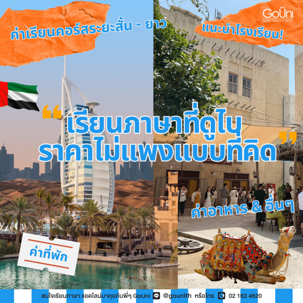 ดูไบกลายมาเป็นอีกหนึ่งเมืองที่คนกำลังนิยมไปเรียนภาษากัน แต่เอ๊ะ? พอพูดถึงดูไบแล้วเหมือนทุกอย่างดูจะแพงไปหมดเลยไหมนะ? จริง ๆ แล้วพี่ GoUni อยากบอกน้อง ๆ ว่าเรียนภาษาที่ดูไบ ราคาไม่แพงแบบที่คิดค่ะ แต่บางอย่างอาจจะขึ้นอยู่กับไลฟ์สไตล์ของเราด้วย เช่น ค่าอาหาร ค่าช็อปปิ้งต่าง ๆ วันนี้เลยจะชวนมาดูรายละเอียดค่าใช้จ่ายต่อเดือนเบื้องต้น ตั้งแต่ค่าเรียน ค่าที่พัก และค่าครองชีพกัน!