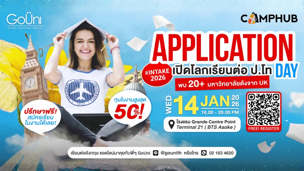 ถ้าอยากให้พี่ GoUni ช่วยประเมินว่าคอร์สไหนเหมาะกับเรา หรืออยากได้คำแนะนำเรื่องสมัคร / ทุน / ค่าใช้จ่าย น้อง ๆ ห้ามพลาดเลย! กับงาน GoUni Application Day #2026intake เปิดโลกเรียนต่อ ป.โท พร้อมสมัครเรียนได้ในงาน ลงทะเบียนร่วมงานฟรี! คลิกที่นี่เลย!