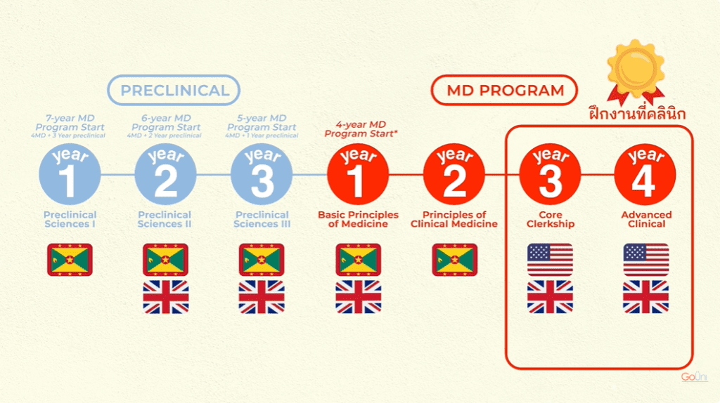 - สำหรับนักเรียนที่มีพื้นฐานทางวิทยาศาสตร์ที่ดี จะเริ่มต้นที่ Preclinical Sciences 2 ปี ตามด้วยการเรียน MD Program 4 ปี