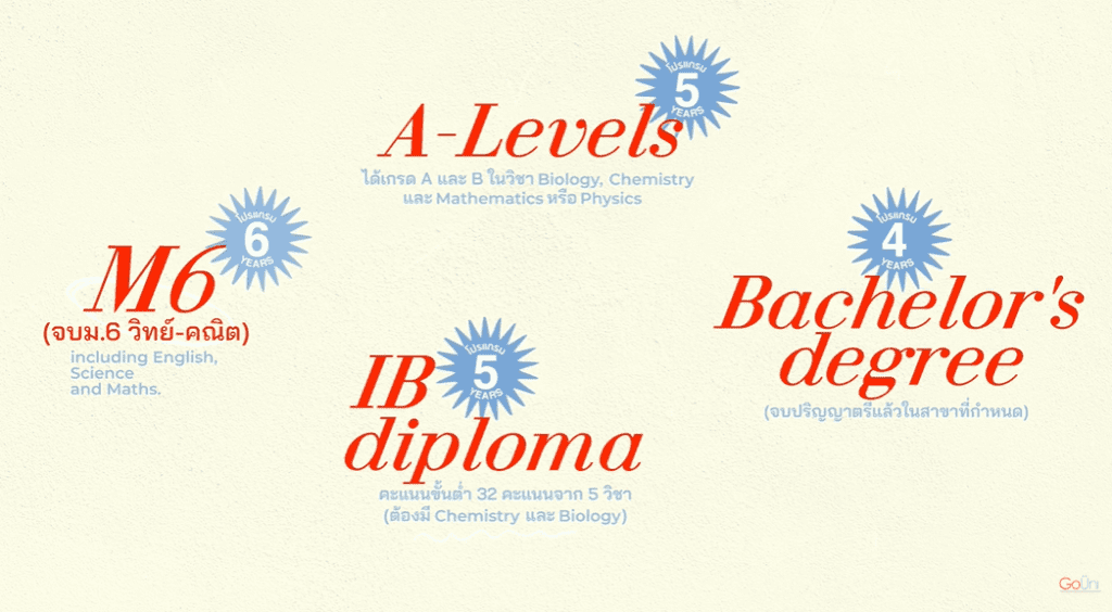 - นักเรียนที่สำเร็จการศึกษาจากหลักสูตรระดับ A-Level หรือ IB สามารถเริ่มเรียน MD Program ได้โดยตรง โดยเรียน Preclinical Sciences เป็นเวลา 1 ปี