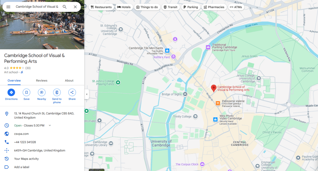Cambridge School of Visual & Performing Arts (CSVPA) เป็นโรงเรียนที่มุ่งเน้นด้านศิลปะและการแสดงในใจกลางเมืองเคมบริดจ์ CSVPA เป็นสถาบันการศึกษาที่เหมาะสำหรับผู้ที่มีความสนใจและความหลงใหลในด้านศิลปะ การออกแบบ แฟชั่น ดนตรี และการแสดง ด้วยการเรียนการสอนที่เน้นทักษะและการปฏิบัติจริง นักศึกษาจึงสามารถพัฒนาความสามารถได้อย่างเต็มที่ และมีโอกาสที่จะประสบความสำเร็จในอาชีพที่ต้องการในวงการศิลปะได้