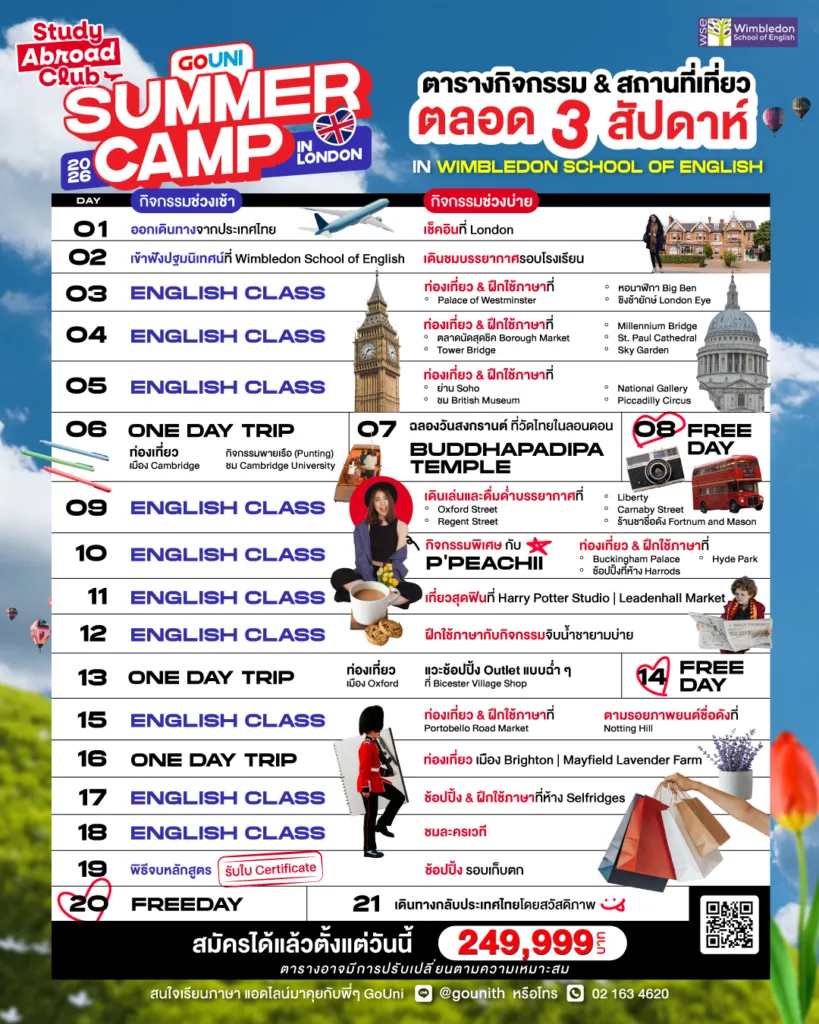 🥳2026 นี้ เตรียมไปเรียนภาษาที่ London + เที่ยวฉ่ำ ๆ ตลอด 3 สัปดาห์ กับ 💙 GoUni Summer Camp in wimbledon School of English กัน! 🏷️ราคา 249,999 บาท แต่แอบกระซิบว่าสมัครวันนี้รับส่วนลดไปเลย 5,000 บาท! ✏️เช้าเรียนภาษาที่โรงเรียน 🛍️บ่ายเที่ยวแลนด์มาร์กดัง ทั้งในและนอก London เตรียมไปช้อปปิ้งกันฉ่ำ ๆ ได้เลย แถมรอบนี้มีกิจกรรมพิเศษกับพี่พีชชี่ด้วยนะ 🥰 📅เริ่มเรียน 6 – 26 เมษายน 2026 🧒🏻อายุ 15 ปีขึ้นไป 🗣️เปิดรับทุก Level ภาษาอังกฤษ ราคานี้รวมอะไรบ้าง? ✅ค่าเรียนคอร์ส General English กับโรงเรียน Wimbledon School of English ✅ค่าที่พักแบบห้องนอน 2 คน ✅ค่าตั๋วเครื่องบินไป – กลับ (ชั้นประหยัด) ✅ค่ารถรับ – ส่งสนามบิน และวันที่ไปทัศนศึกษา ✅ค่าวีซ่า + ค่าประกัน ✅ค่าเข้าสถานที่ท่องเที่ยว ✅ค่า Afternoon tea + ค่าอาหารมื้อแรก ✅ค่ากิจกรรมกับพี่พีชชี่ *ทีมงานขอสงวนสิทธิ์ในกรณีที่มีการเปลี่ยนแปลงล่วงหน้า โดยจะเป็นระดับ “เทียบเท่า” กับที่กำหนดไว้ด้านบน 📍สนใจสมัครเรียนหรือสอบถามเพิ่มเติม ทักหา GoUni ได้เลย! สมัครวันสุดท้ายวันที่ 16 มกราคม 2026 ——————————— ปรึกษาเรื่องเรียนต่อฟรี! 📩 https://m.me/gouni.th 📲 Line: @gounith (https://bit.ly/47FplVN) 📫 https://gouni.co.th/contact-us/ 📞 02-163-4620 #GoUni #GoUnithailand #fypp #fyppppppppppppppppppppppp #เรียนต่างประเทศ #fyp #UK #เรียนต่อต่างประเทศ #เรียนต่ออังกฤษ #อังกฤษ #เรียนภาษาอังกฤษ #london